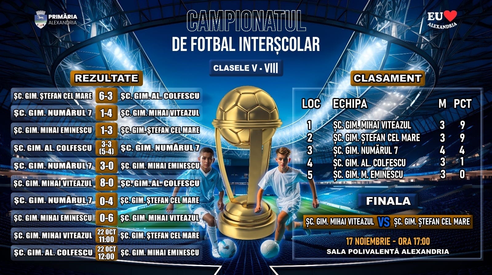 Deși campionatul mai are două meciuri de disputat, între Școala Gimnazială „Mihai Viteazul” și Școala Gimnazială „Ștefan cel Mare”, și un al doilea meci între Școala Gimnazială „Alexandru Colfescu” și Școala Gimnazială „Mihai Eminescu”, rezultatele de până acum au făcut ca finala să fie deja decisă. Cele două echipe invincibile până în acest moment, „Mihai Viteazul” și „Ștefan cel Mare”, vor lupta pentru marele trofeu pe 17 noiembrie, într-un meci care promite spectacol și determinare maximă.