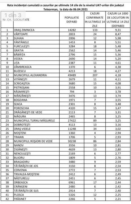 În județul Teleorman sunt, în acest moment, 14 localități în care rata de infectare depășește 4 la mia de locuitori, iar printre acestea se află și Alexandria, reședința județului.