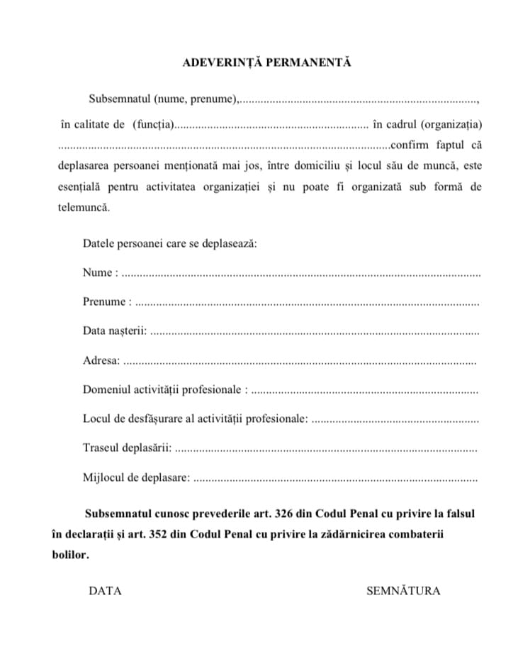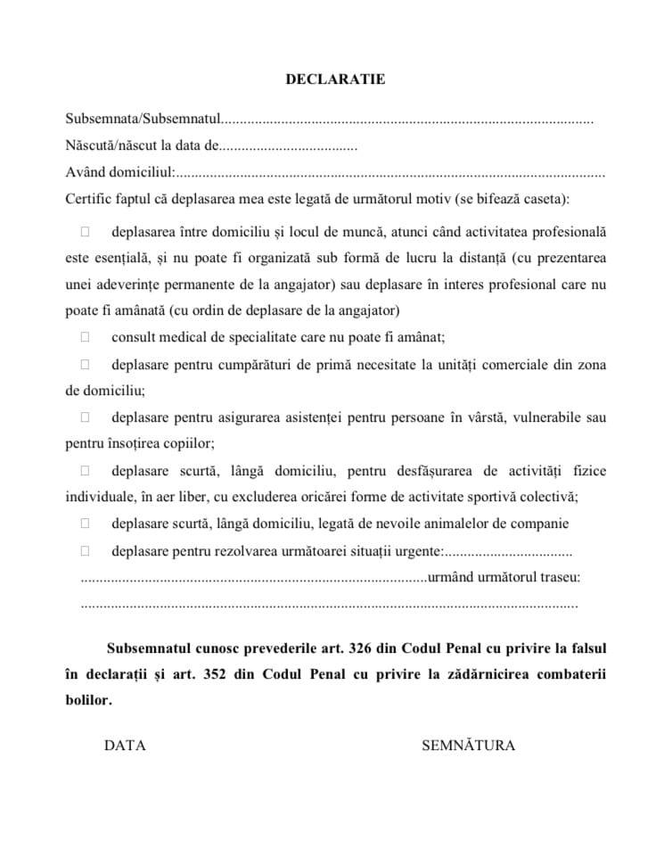 Trebuie să ieși din casă după ora 22:00? În cazul acesta trebuie să completezi o declaraţie pe proprie răspundere în care să precizezi motivul deplasării, iar în cazurile speciale, şi traseul acesteia. În cazul celor care merg la serviciu, este necesară o adeverinţă permanentă din partea angajatorului care să ateste că prezenţa la locul de muncă este esenţială pentru activitatea organizaţiei şi nu poate fi organizată sub formă de telemuncă.