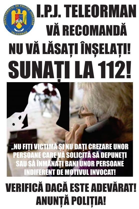 În nici un caz nu daţi crezare imediat unor poveşti tragice anunţate telefonic de persoane care pretind că au calitate oficială, ci verificaţi informaţia printr-un apel la 112 sau sesizaţi cea mai apropiată unitate de poliţie!