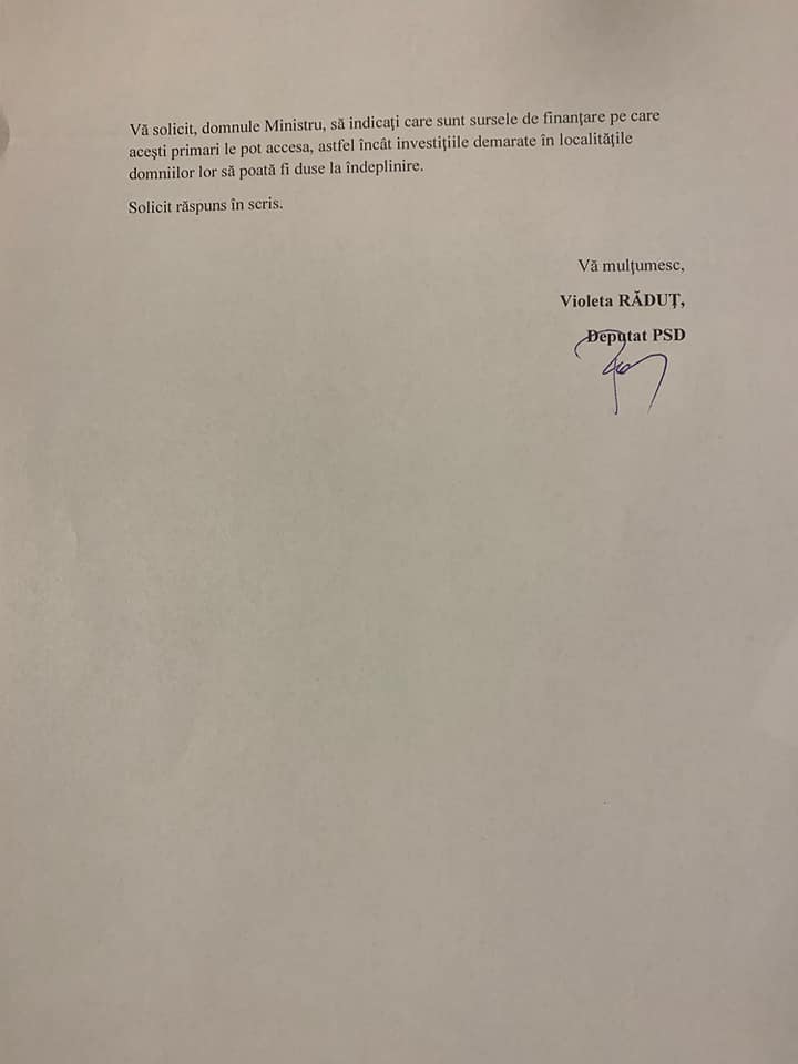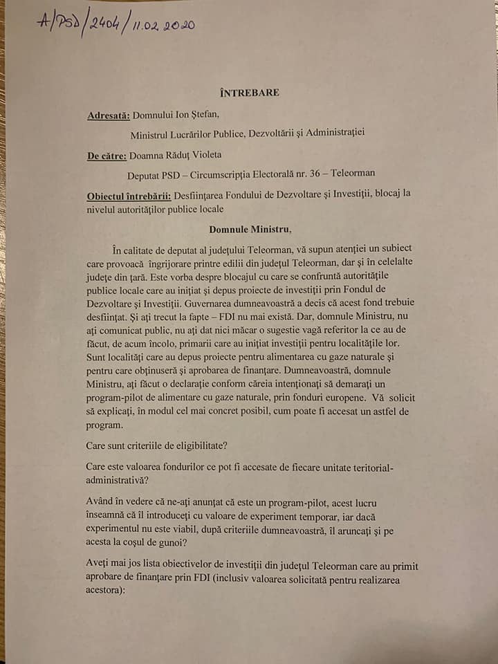 ”Guvernarea dumneavoastră a decis că Fondul de Dezvoltare și Investiții trebuie desființat. Și ați trecut la fapte – FDI nu mai există. Dar nu ați dat nici măcar o sugestie vagă referitor la ce au de făcut, de acum încolo, primarii care au inițiat investiții pentru localitățile lor. Sunt localități care au depus proiecte pentru alimentarea cu gaze naturale și pentru care obținuseră aprobare de finanțare”, spune Violeta Răduț.